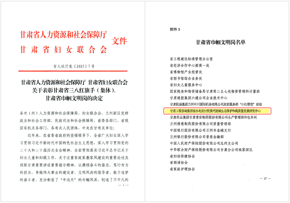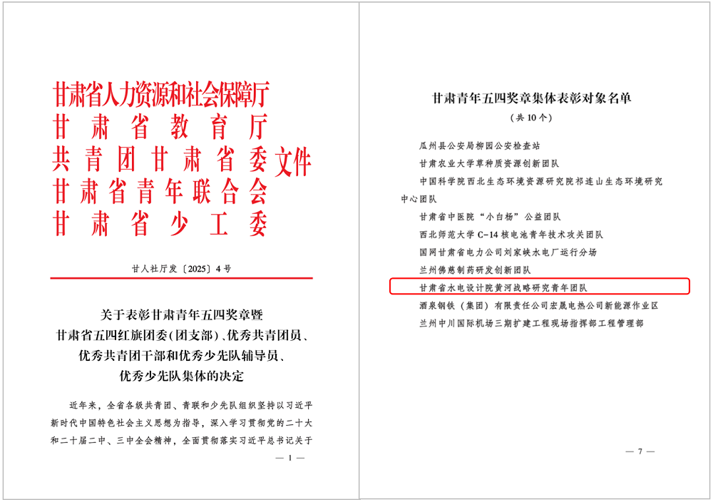 2025年10月21日,省人社厅、省教育厅、团省委等5家单位联合印发《关于表彰甘肃省青年五四奖章暨甘肃省五四红旗团委(团支部)、优秀共青团员、优秀共青团干部和优秀少先队辅导员、优秀少先队集体的决定》,黄河研究中心申报的“甘肃省水电设计院黄河战略研究青年团队”荣获“甘肃青年五四奖章”荣誉称号,是全省10个荣誉集体之一。12月26日,省人力资源和社会保障厅、甘肃省妇女联合会印发《关于表彰甘肃省三八红旗手(集体)、甘肃省巾帼文明岗的决定》,黄河研究中心团队荣获“甘肃省巾帼文明岗”称号。