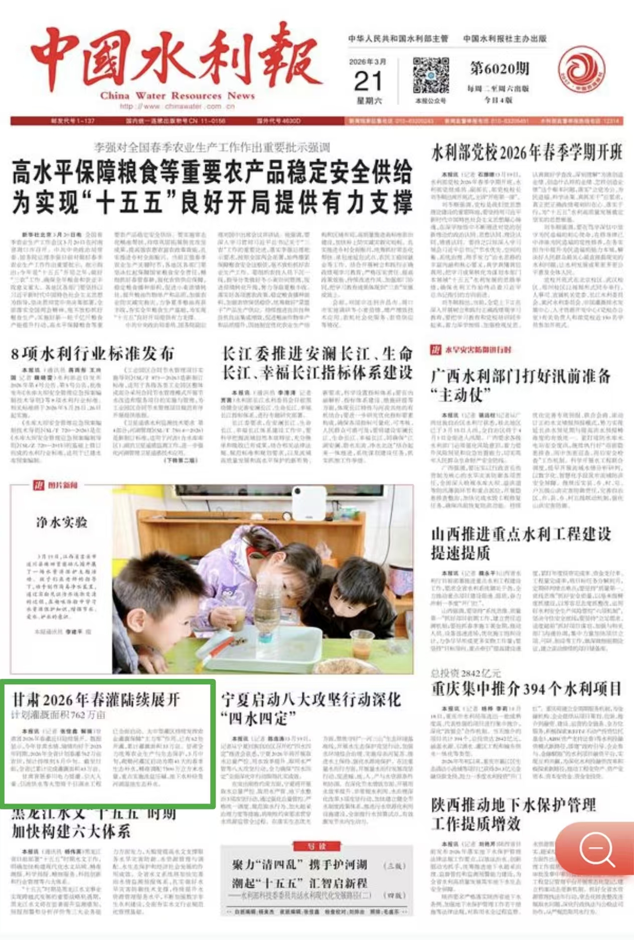 甘肃省景泰川电力提灌、引大入秦、引洮供水等大型骨干引调水工程已全面启动。大中型灌区持续发挥农业灌溉保障“主力军”作用,已有62处开灌,累计灌溉面积33万亩。甘肃全力统筹农业生产与生态保护,3月中旬,疏勒河灌区启动为期41天的春季生态补水,精准调配7500万立方米水量,重点实施洗盐压碱、地下水补给及河湖湿地生态补水。
